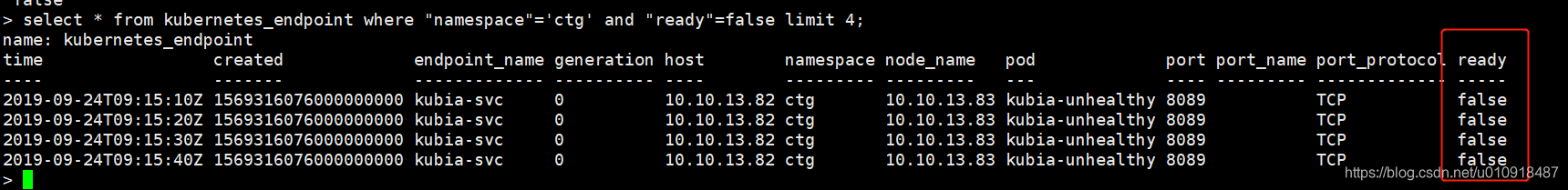batch|query('''SELECT * FROM "telegraf"."autogen"."kubernetes_endpoint" WHERE "namespace"='ctg' ''').period(1m).every(1s)|alert().message('{{ .Level}}:{{ index .Fields "pod"}} is unready, pls check.host: {{ index .Fields "host"}}, node name: {{ index .Fields "node_name"}}').warn(lambda: "ready" == bool('0')).log('/root/pod_alerts.log').email('xxx@qq.com')