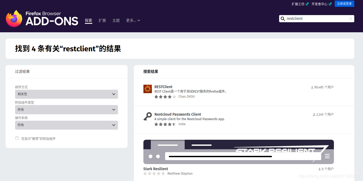 在浏览器附加组件选项中搜索RESTClient,如下图