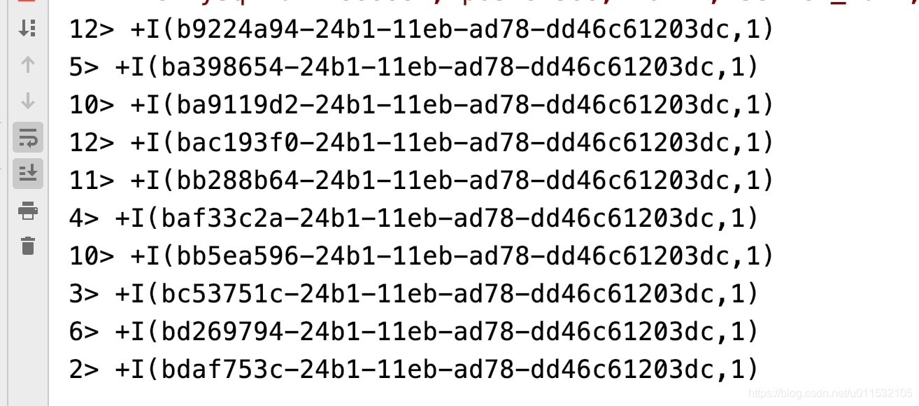 def main(args: Array[String]): Unit = {val envSetting = EnvironmentSettings.newInstance().useBlinkPlanner().inStreamingMode().build()val env = StreamExecutionEnvironment.getExecutionEnvironmentval tableEnv = StreamTableEnvironment.create(env, envSetting)val sourceDDL ="CREATE TABLE test_binlog (" +" id INT NOT NULl," +" ip STRING," +" size INT" +") WITH (" +"'connector' = 'mysql-cdc'," +"'hostname' = 'localhost'," +"'port' = '3306'," +"'username' = 'root'," +"'password' = 'cain'," +"'database-name' = 'test'," +"'table-name' = 't_test'" +")"// 输出目标表val sinkDDL ="CREATE TABLE test_sink (\n" +" ip STRING,\n" +" countSum BIGINT,\n" +" PRIMARY KEY (ip) NOT ENFORCED\n" +") WITH (\n" +" 'connector' = 'print'\n" +")"val exeSQL ="INSERT INTO test_sink " +"SELECT ip, COUNT(1) " +"FROM test_binlog " +"GROUP BY ip"tableEnv.executeSql(sourceDDL)tableEnv.executeSql(sinkDDL)val result = tableEnv.executeSql(exeSQL)result.print()}