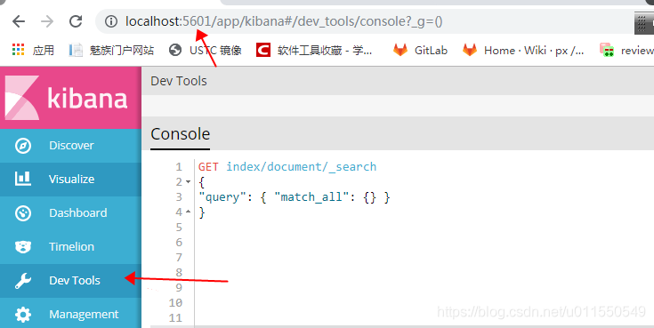 出现listen后,在本地浏览器中打开:localhost:5601,在dev tools中可以使用es命令查询配置的数据库,下面是查询一个索引下类型里所有的东西: