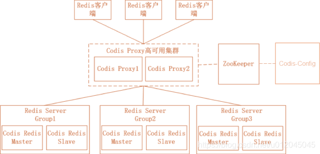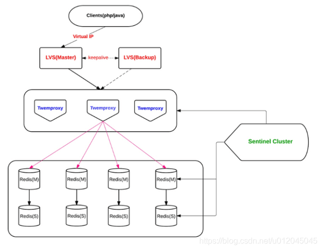 多个同构 Twemproxy(配置相同)同时工作,接受客户端的请求,根据 hash 算法,转发给对应的 Redis。