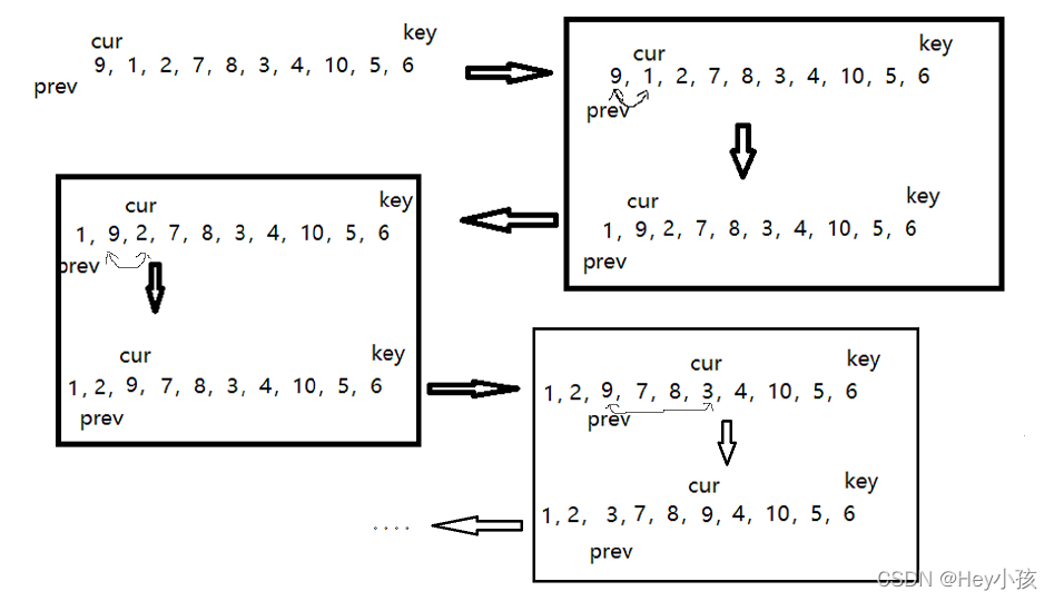 }void InsertSort(int* array, int size) {//直接插入排序for (int i = 1; i < size; i++) {//从1开始循环,默认数组内第一个元素为有序序列int end = i - 1;//标记已排序序列最后位置下标int key = array[i];//依次拿取数组内元素while (end >= 0 && key < array[end]) {//key从前往后比较:小于当前元素,继续往前走array[end + 1] = array[end];//将当前元素往后移一个位置end--;}array[end + 1] = key;//key大于等于当前元素,插入到当前位置之后}