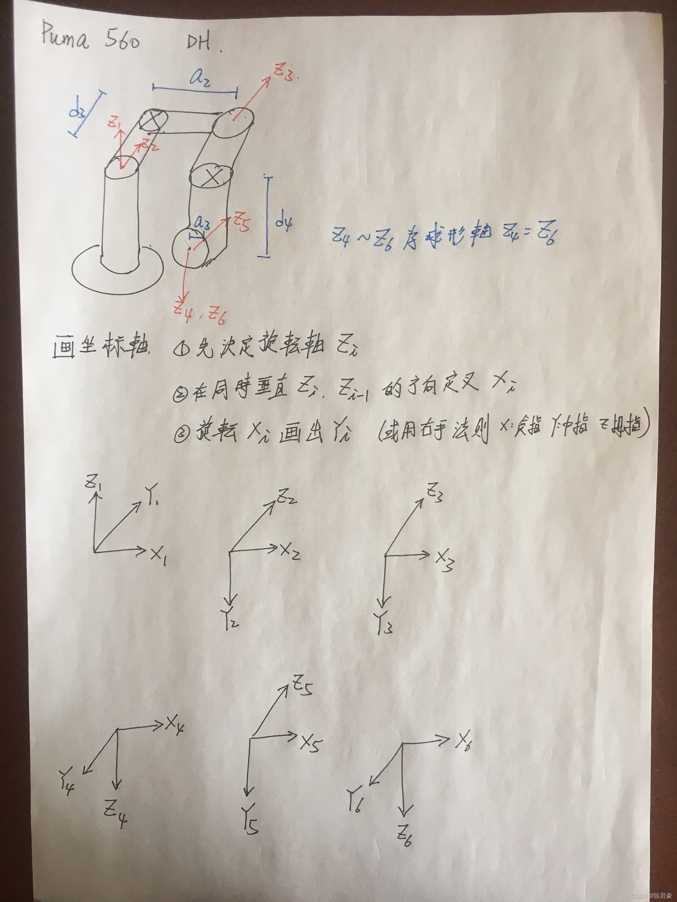 2. theta是旋转轴,定义theta1-theta6,注意alpha和a是从0-5, d和theta是从1-6,因为alpha和a是从原坐标的角度看的