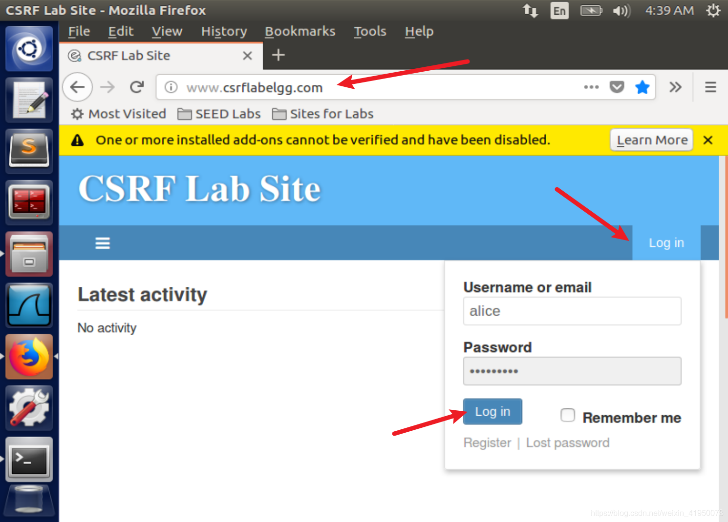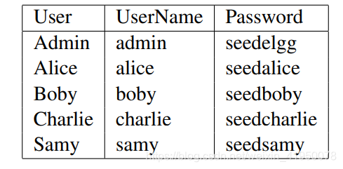 Elgg网络应用。在本实验中,我们使用了一个名为Elgg的开源网络应用程序。Elgg是一个基于网络的社交网络应用。它已经在预先构建的Ubuntu虚拟机映像中设置好了。我们还在Elgg服务器上创建了几个用户帐户,凭据如下: