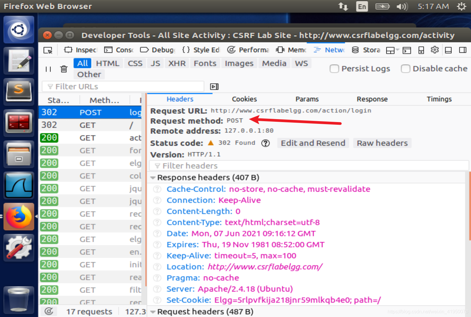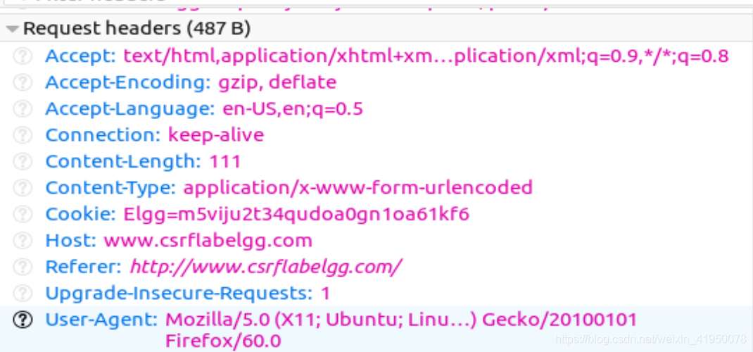 网络应用程序Elgg使用秘密令牌方法。它在请求中嵌入了两个参数elggts和elggtoken,作为对CSRF攻击的对策。这两个参数被添加到用于POST请求的HTTP消息体和用于HTTP GET请求的URL字符串中。