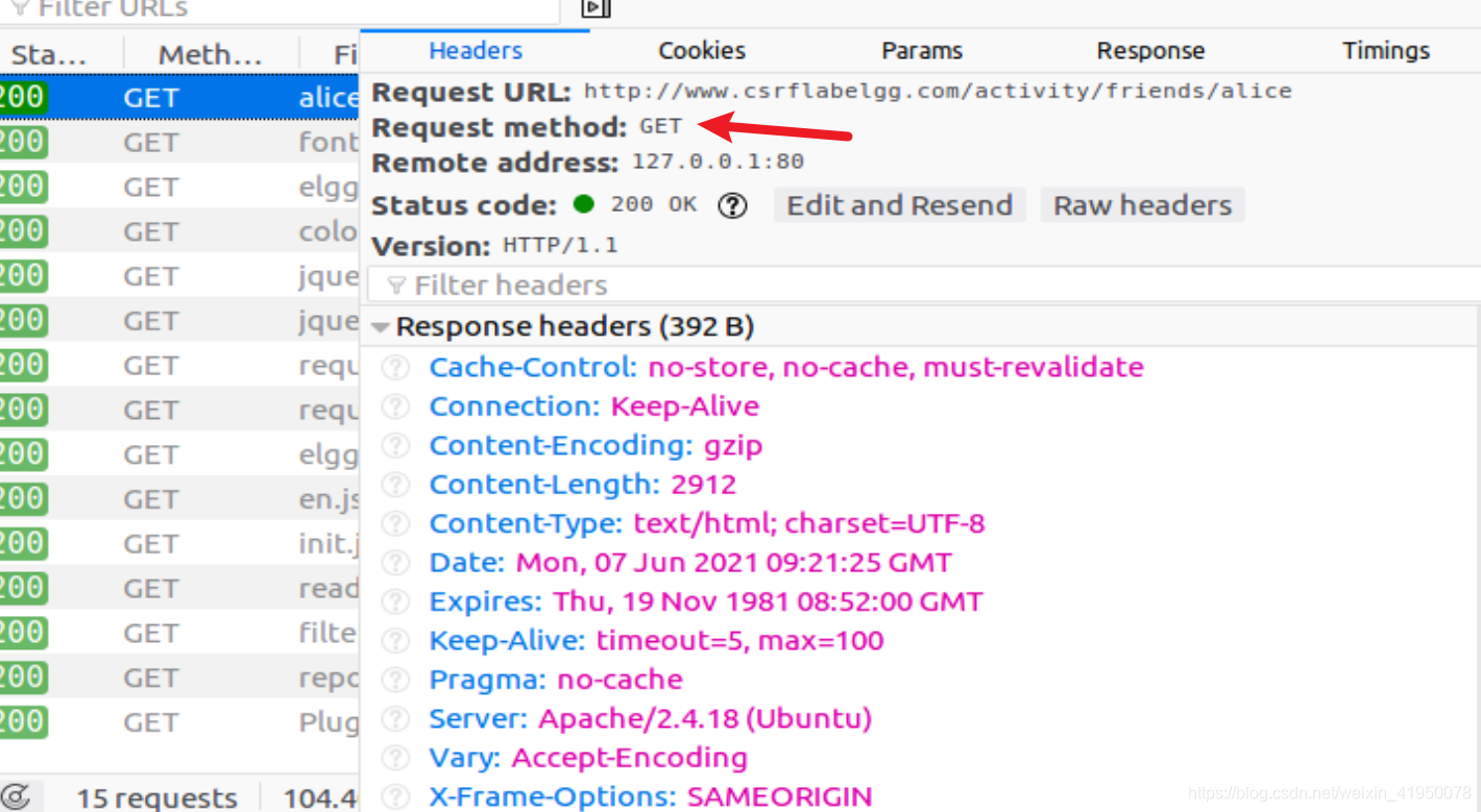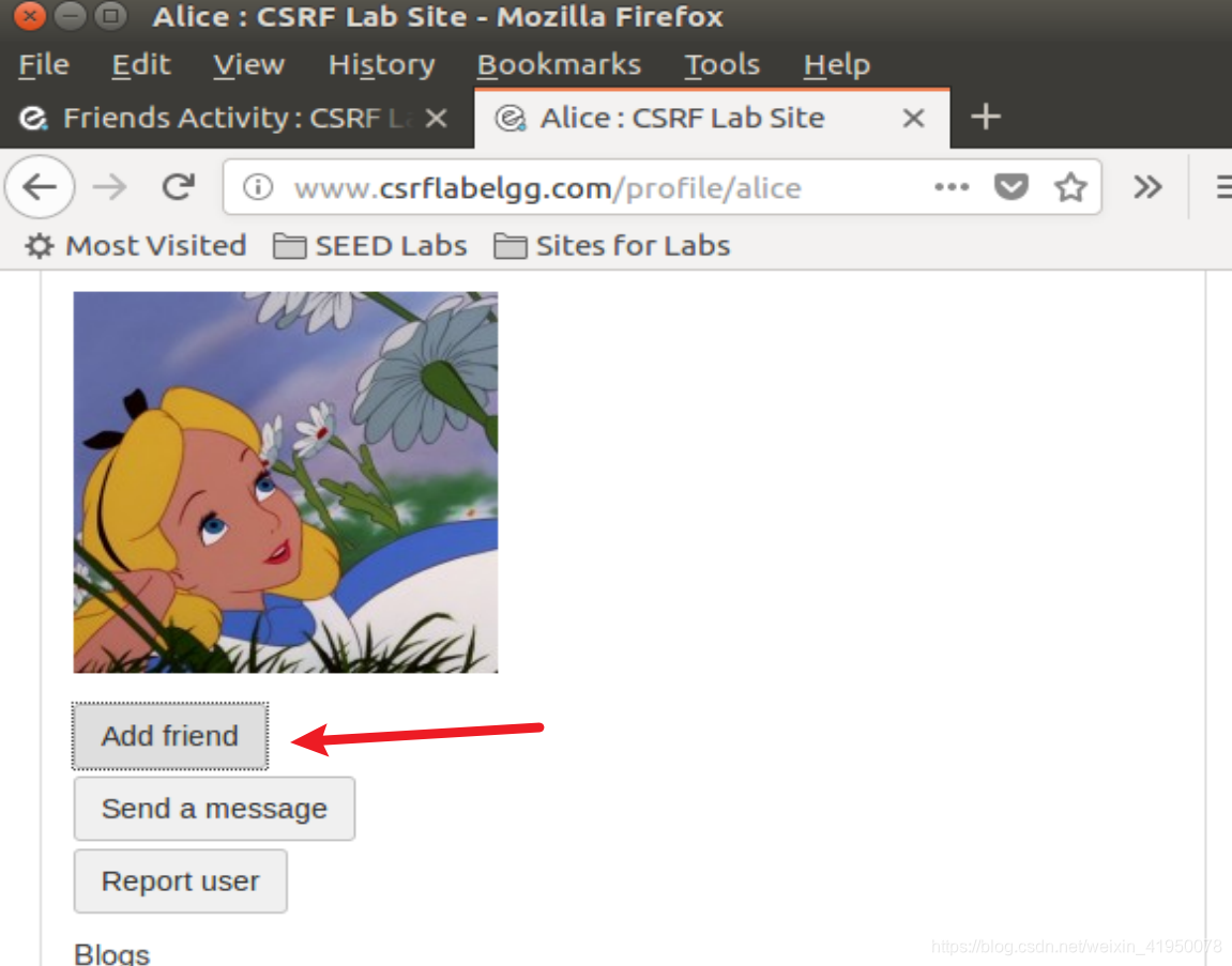 要向受害者添加朋友,我们需要识别合法的添加朋友HTTP请求(GET请求)是什么样子的。我们可以使用“HTTP Header Live”工具进行调查。在此任务中,不允许您编写JavaScript代码来发起CSRF攻击。您的工作是在Alice访问网页时立即使攻击成功,甚至不需要在网页上进行任何点击(提示:您可以使用img标签,它会自动触发HTTP GET请求)。