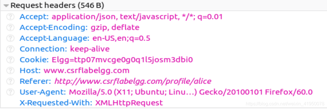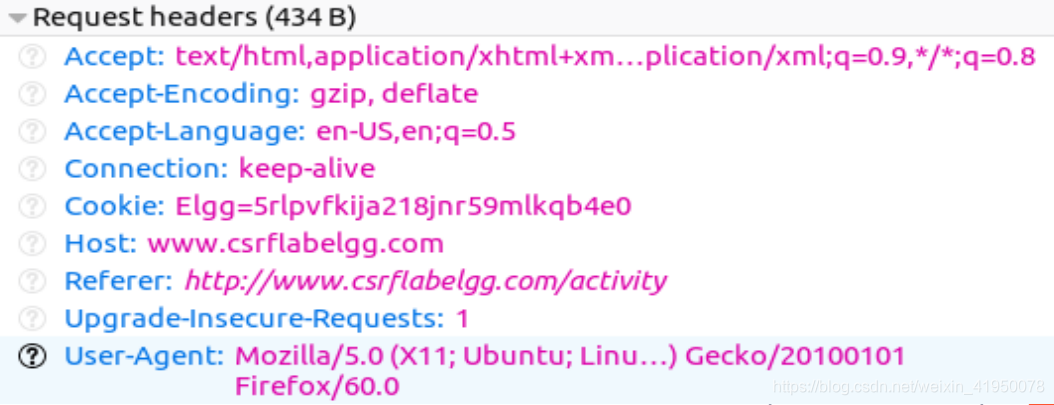 在跨站点请求伪造攻击中,我们需要伪造HTTP请求。因此,我们需要知道一个合法的HTTP请求是什么样子的,使用什么参数等等。我们可以为此使用一个名为“HTTP Header Live”的Firefox插件。这个任务的目标是熟悉这个工具。指南部分(4.1)给出了如何使用该工具的说明。请使用此工具在Elgg中捕获一个HTTP GET请求和一个HTTP POST请求。在您的报告中,请确定这些请求中使用的参数(如果有)。