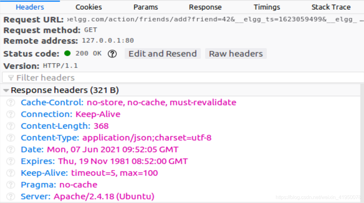 Elgg加实施了一项对抗CSRF袭击的对策。在添加朋友的HTTP请求中,您可能会注意到每个请求都包括两个看起来像有线的参数,elggts和elggtoken。这些参数由对策使用,因此如果它们不包含正确的值,Elgg将不会接受该请求。我们已经禁用了本实验的对策,因此没有必要在伪造的请求中包含这两个参数