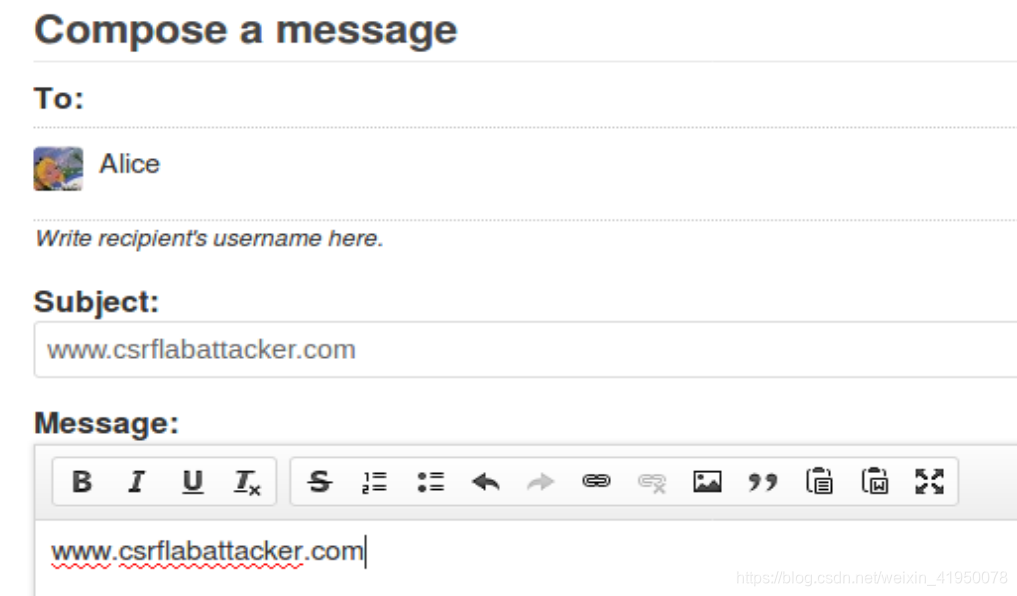 攻击的一种方法是向Alice的Elgg帐户发布一条消息,希望Alice能点击消息中的网址。这个网址将引导Alice到你的(即Boby的)恶意网站www . csrflabattacker.com,在那里你可以发动CSRF攻击。