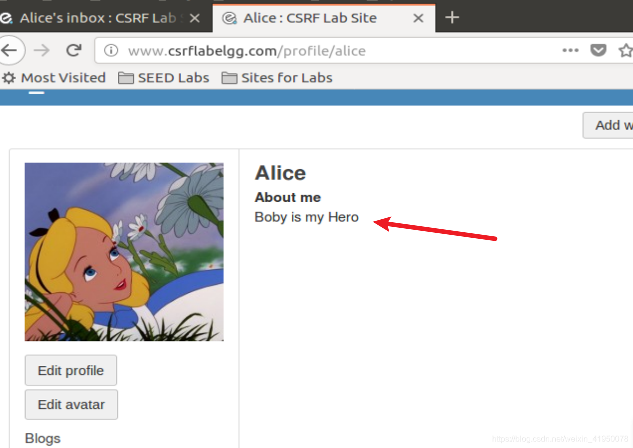 在把自己加入Alice的好友名单后,Boby想做更多的事情。他想让Alice在她的简介中说“Boby是我的英雄”,所以每个人都知道这一点。Alice不喜欢Boby,更不用说把这句话写进她的简介里了。Boby计划用CSRF进攻来达到这个目标。这就是这项任务的目的。
