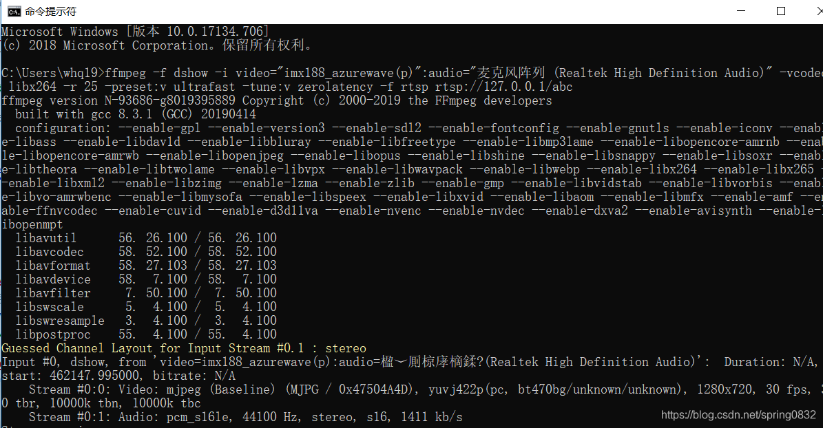 ffmpeg -f dshow -i video="imx188_azurewave(p)":audio="麦克风阵列 (Realtek High Definition Audio)" -vcodec libx264 -r 25 -preset:v ultrafast -tune:v zerolatency -f rtsp rtsp://127.0.0.1/test