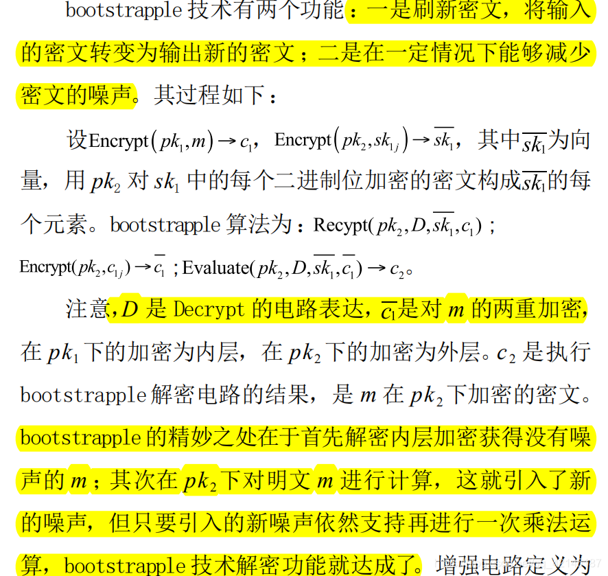 Gentry使用bootstrale技术来控制密文的噪声,即通过分别对密文和密钥按位加密后输入解密电路,刷新密文,依次进行下去