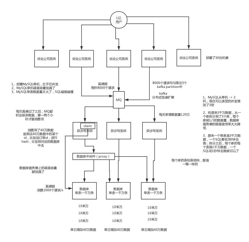 但是我们同时也是不幸的,因为此时每天活跃用户数上千万,每天单表新增数据多达50万,目前一个表总数据量都已经达到了两三千万了!扛不住啊!数据库磁盘容量不断消耗掉!高峰期并发达到惊人的5000~8000!别开玩笑了,哥。我跟你保证,你的系统支撑不到现在,已经挂掉了!