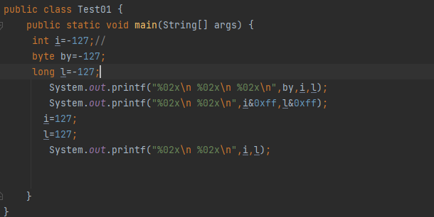 java中的byte类型占用一字节,int类型占用2字节,long类型为四字节。当负数转为补码时,转换原理是:最高位(符号位)不变,其余位按位取反,然后末位加1。所以当int类型和long类型的的-127转为补码时,除了符号位外(负数符号位是1)和低八位外(低八位存储-127),其他位(原码全为0)会全变为1,所以最终的结果除了低八位外其他位全为1,转换为16进制的话每连续的每四位1就是一位f。正数由于符号位是0,且正数的补码就是原码,不用换算,int和long类型的127的高位全是0,转换为16进制也是0。