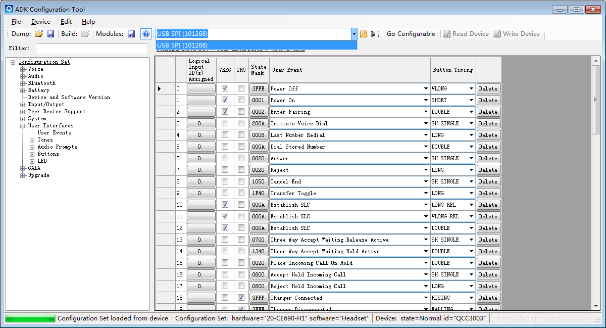 连接成功之后,点击go configurable进入可配置模式,然后可以点击read device从芯片中载入配置,修改完成之后点击write device将配置写入芯片,最后点go normal使芯片进入正常运行。