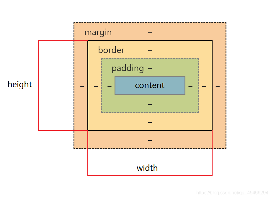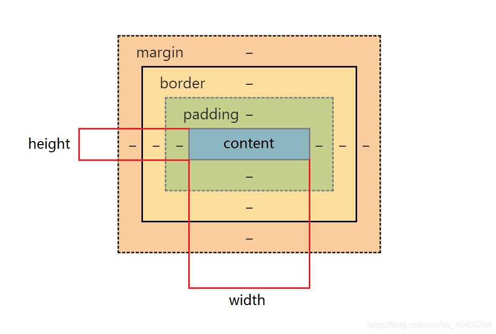 1、标准盒模型中width指的是内容区域content的宽度;height指的是内容区域content的高度