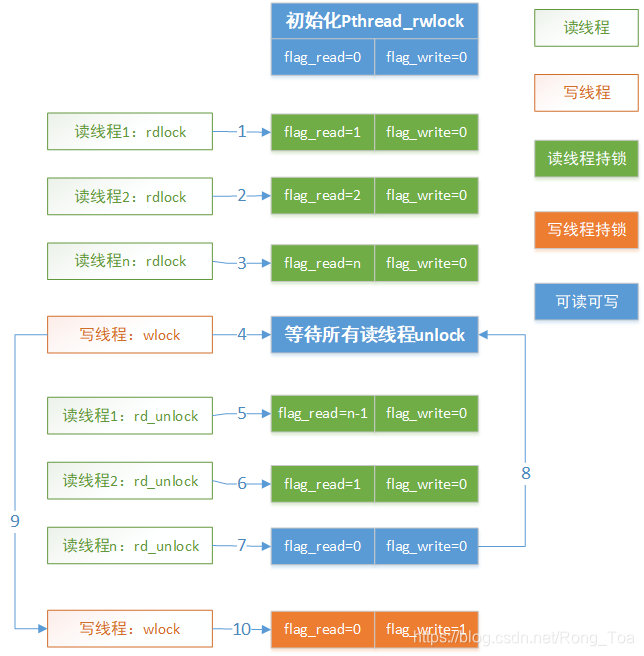 - 8.所有读线程均释放了该锁,此时写线程获取该锁,从“等待”继续执行;