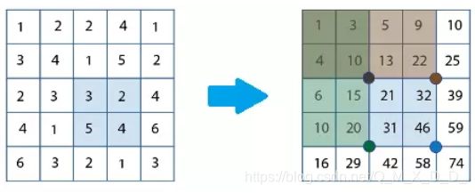 积分图是一张和输入图像大小一样的图,但积分图上每个像素点所保存的信息不再是原图像上像素点的灰度,而是从左上角到这个点所选定的矩形区域内所有像素点的灰度之和。例如: