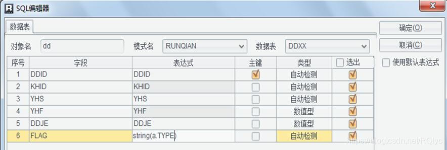 也就是说,保存时会将 a.TYPE 的值保存到 FLAG 字段中。这里对通过 string() 函数把 a.TYPE 转换成字符串,这样就可以将 F2 单元格的值保存到数据库表的对应状态位中。F 列为控制状态列,设置完成后将列宽设成 0 即可。