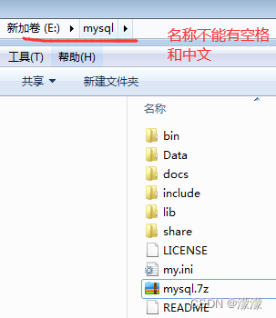 - 下载最好解压到磁盘根目录下,因为mysql目录名不能有空格,所以不能安装在program files文件夹里。