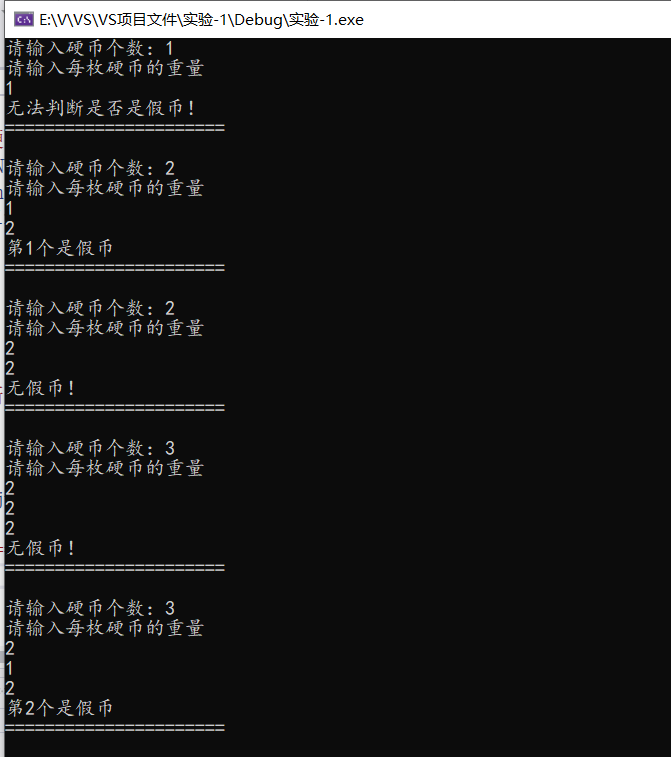 {int coin_weight[MAX];int NUM;while (1){cout << "请输入硬币个数:";cin >> NUM;cout << "请输入每枚硬币的重量" << endl;for (int i = 0; i < NUM; i++)cin >> coin_weight[i];int judge = found(coin_weight, 0, NUM - 1);if (judge == -1)cout << "无假币!" << endl;else if (judge == 0)cout << "无法判断是否是假币!" << endl;elsecout << "第" << judge << "个是假币" << endl;cout << "======================" << endl;cout << endl;}