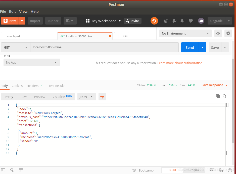 通过向http://localhost:5000/mine 发送 Get 请求来挖矿一个区块
