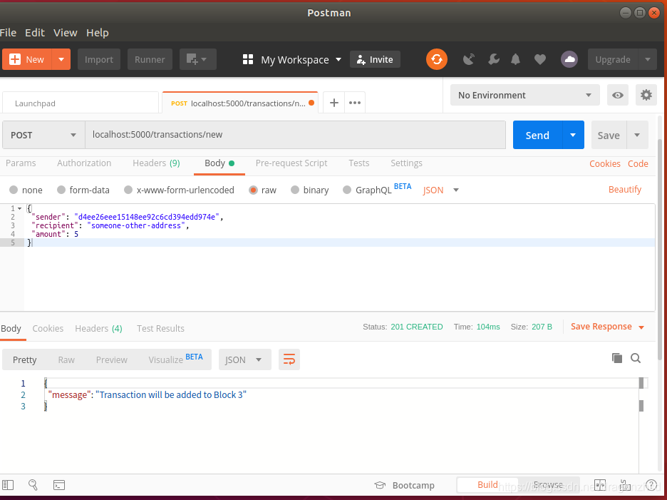 下面通过向 http://localhost:5000/transactions/new 发送POST request 来创建一个新的交易, 其中 body包含以下交易结构: