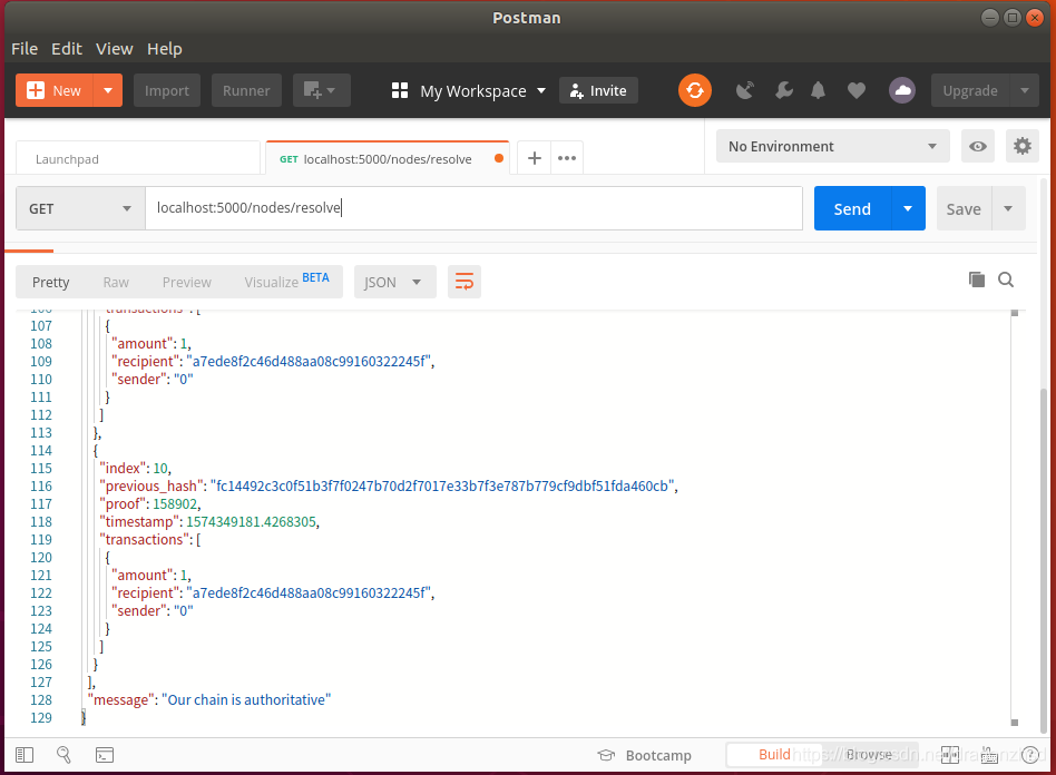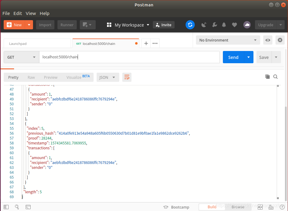 你可以向http://localhost:5000/mine多发送几次请求,多挖几个区块。然后向 http://localhost:500/chain发送请求,可以查看整个链。