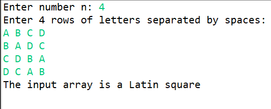 // D C A Bpublic static void showLatinSquare() {try(Scanner input = new Scanner(System.in);) {System.out.print("Enter number n: ");int n = input.nextInt();char[][] array = new char[n][n];System.out.println("Enter " + n + " rows of letters separated by spaces: ");try {inputData(input, array);System.out.println("The input array is " + (isLatinSquare(array) ? "" : "not ") + "a Latin square");}catch (InputMismatchException e) {System.out.println(e.getMessage());}}}/**是拉丁正方形吗?*/public static boolean isLatinSquare(char[][] array) {Set<Character> rows = new HashSet<>(4); //行集合Set<Character> columns = new HashSet<>(4); //列集合for (int i = 0; i < array.length; i++) {for (int j = 0; j < array[i].length; j++) {rows.add(array[i][j]);columns.add(array[j][i]);}if(rows.size() < array.length || columns.size() < array.length)return false; //如果行或列集合的大小小于数组长度,返回false}return true;}/**接收数据输入*/public static void inputData(Scanner input, char[][] array) {for (int i = 0; i < array.length; i++) for (int j = 0; j < array[i].length; j++) {array[i][j] = input.next().charAt(0);if(array[i][j] < 'A' || array[i][j] > (char)('A' + array.length - 1))throw new InputMismatchException("Wrong input: the letters must" + " be from A to " + ((char)('A' + array.length - 1)));}}