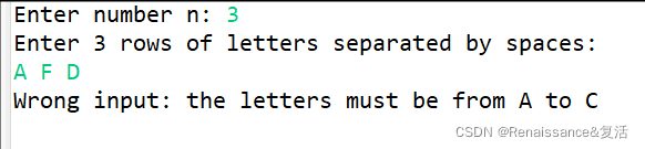 拉丁方阵是一个n*n的数组,其中有n个不同的拉丁字母,并且每个拉丁字母恰好只在每行和每列中出现一次。编写一个程序,提示用户输入数字n和字符数组,如示例输出所示,检测该输出数组是否是一个拉丁方阵。字符是从A开始的前面n个字符。