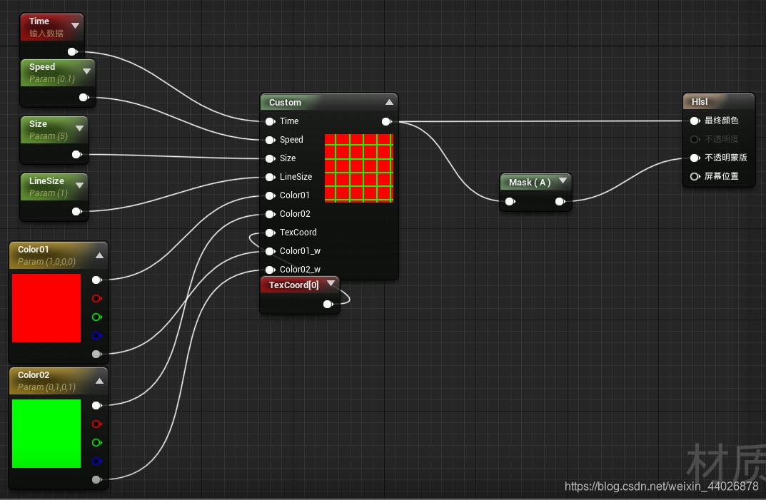 这里面还有优化的空间,比如说参数化后的颜色、RGB 和A是分开的、 可以合并在一起,中间为了看效果就用的A1、A2、A3、去使用,其实这一套一个就可以了,但是意思已经到位了。