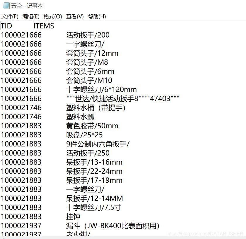 Trans <- read.transactions(file ="./五金对应领料单.txt" ,format="single",header=TRUE,cols=c("TID","ITEMS"),sep="",encoding = "UTF-8") #从EXCEL转成TXT之前,把表里的特殊符号全删掉;导出TXT之后另存为UTF-8