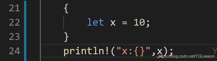 可以看到打印x处,被标红,rust语言支持包检测到了语法错误。