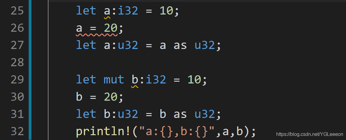 在C/C++中除了const类型,其他的变量都是可以被修改的,但是在rust中除了const这种类型特性没什么区别意外,多了mutable和immutable前缀。如果不声明为mut变量,rust中默认为immutable,及不可变。其特性是在初始化之后不能被修改,但是和const不一样的是,immutable变量是可以重新定义的,之前定义的同名变量会被隐去无法访问。这一点在c/c++中是没有的,如果在c中对一个一个变量定义多次,会有重定义报错。如果加了mut前缀,那么该变量就和c/c++中的一般变量声明和修改就很相似了。一下是示例: