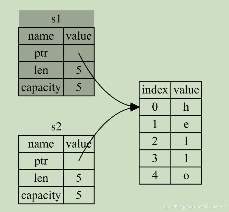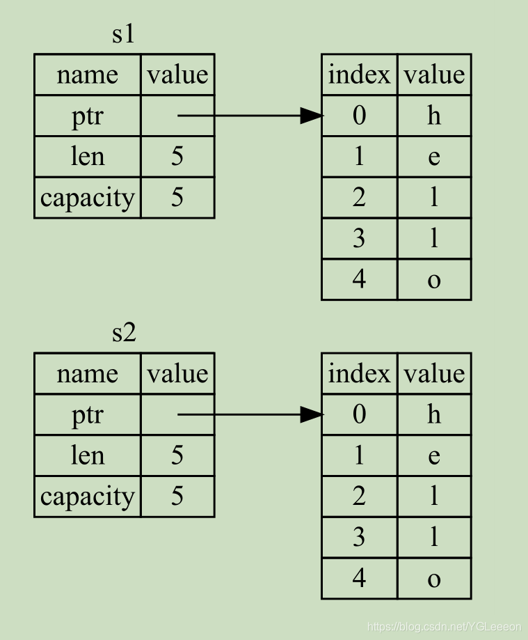 传值操作是对于那种复杂数据而言,比如string。存储这种数据不仅需要栈来存储简单数值(长度和只想数据实体的指针)还需要堆存储较大的数据实体。完成船只操作就是将数据的owner转移到另一个owner上,以前的owner(即变量名)就不能再使用了!这一点与c/c++区别很大,因为c系语言是允许多个不同名指针指向同一份数据的。在rust中完成传值操作后,仅仅是将栈中的数据进行复制,而指针指向堆中的数据实体是同一个,旧的owner此时会失效。
