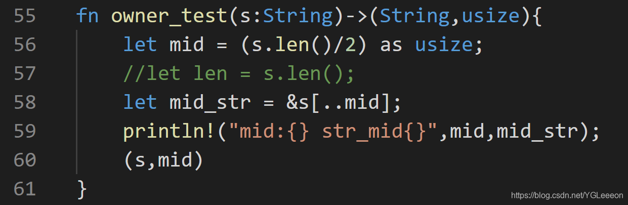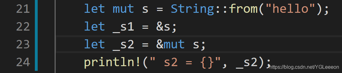 可以发现3.2中使用传值进行函数参数赋值的操作有点蠢。那么类似c语言中的指针参数或者c++中的引用参数,rust也给出了一种引用类型前缀&。但是看到这里本人就有一个疑问,如果一个owner被多个引用类型引用,是否打破了只有一个owner的原则。然后rust编程语言手册上紧跟着就有说明,引用类型也分为mutable(let _s = &mut s)和immutable(let _s = &s)。对于后者可以有任意多个引用变量,它可以访问数据实体,但是不能修改数据实体。前者是每个变量只允许拥有一个mut 引用,该类型的引用可以修改数据实体,但是必须在其他引用的访问操作完成之后才可以使用(为的是保证之前的引用访问的数据是有效的),给一个例子: