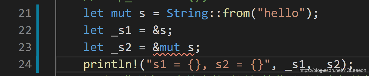 在上左图,企图在打印_s1之前创建一个可变引用,出现了一个语法错误。而在右图,在所有的不可变引用完成操作之后创建可变引用就是被允许的。
