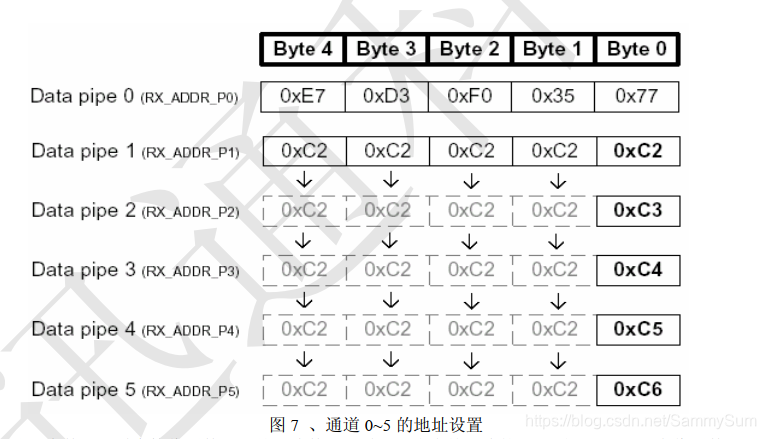 通过上述的配置,就可以实现NRF24L01的一对多通信了。如果想要知道数据是来自哪一个通道,可以读取STATUS这个寄存器的3:1位来确定。