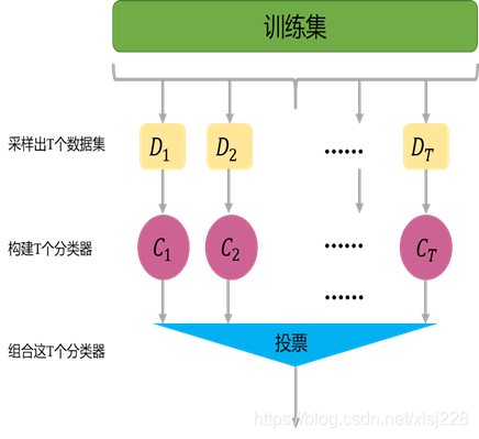 首先从数据集中采样出T个数据集,然后基于这T个数据集,每个训练出一个基分类器,再将这些基分类器进行组合做出预测。Bagging在做预测时,对于分类任务,使用简单的投票法。对于回归任务使用简单平均法。若分类预测时出现两个类票数一样时,则随机选择一个。Bagging非常适合并行处理。