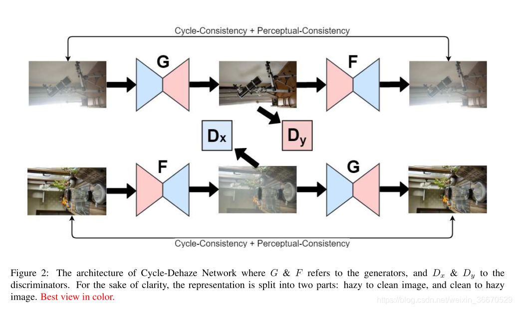 总之,Cycle-Dehaze优化了CycleGAN架构,根据等式4和等式5,在等式3中给出了额外的循环感知一致性损失。为了获得无雾图像,在测试时使用发生器G *。