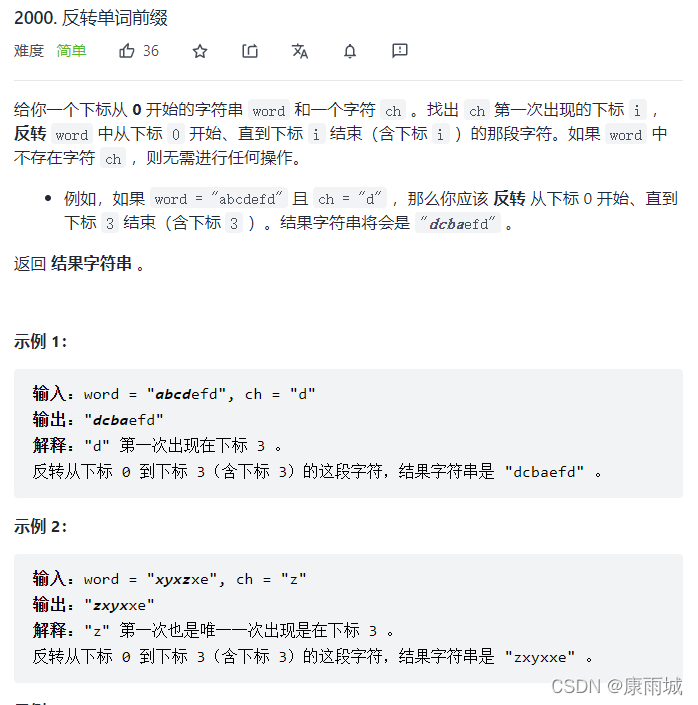 public class Solution2000 {public String reversePrefix(String word, char ch) {int index = word.indexOf(ch);if (index == -1) {return word;}StringBuilder rev = new StringBuilder(word.substring(0, index + 1));return rev.reverse().toString() + word.substring(index + 1);}