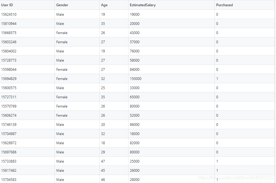 数据集如下(共400条数据,4个特征,这里我们不使用ID和性别,只使用年龄和收入两个特征):