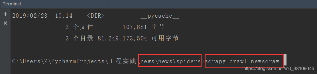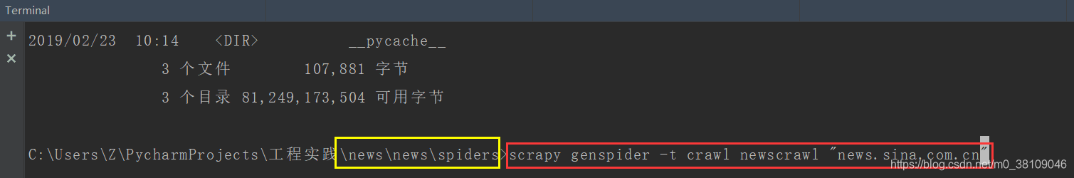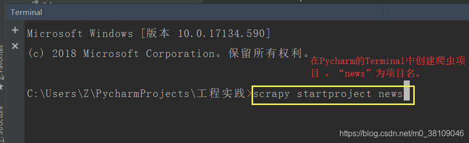 1.在Pycharm的Terminal中输入“scrapy startproject news”创建爬虫项目,“news”为项目名。