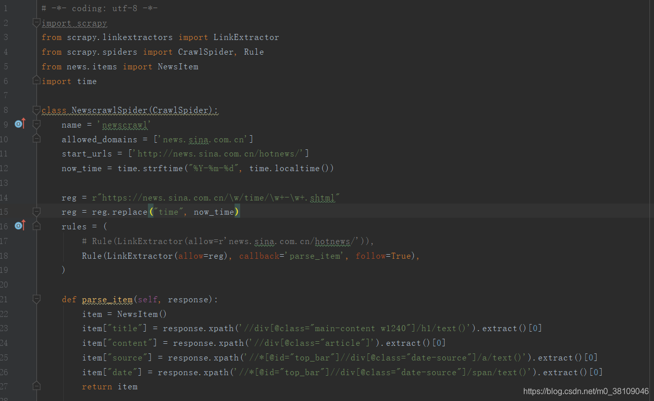 # -*- coding: utf-8 -*- import scrapy from scrapy.linkextractors import LinkExtractor from scrapy.spiders import CrawlSpider, Rule from news.items import NewsItem import timeclass NewscrawlSpider(CrawlSpider):name = 'newscrawl'allowed_domains = ['news.sina.com.cn']start_urls = ['http://news.sina.com.cn/hotnews/']now_time = time.strftime("%Y-%m-%d", time.localtime())reg = r"https://news.sina.com.cn/\w/time/\w+-\w+.shtml"reg = reg.replace("time", now_time)rules = (# Rule(LinkExtractor(allow=r'news.sina.com.cn/hotnews/')),Rule(LinkExtractor(allow=reg), callback='parse_item', follow=True),)def parse_item(self, response):item = NewsItem()item["title"] = response.xpath('//div[@class="main-content w1240"]/h1/text()').extract()[0]item["content"] = response.xpath('//div[@class="article"]').extract()[0]item["source"] = response.xpath('//*[@id="top_bar"]//div[@class="date-source"]/a/text()').extract()[0]item["date"] = response.xpath('//*[@id="top_bar"]//div[@class="date-source"]/span/text()').extract()[0]return item2. items.py