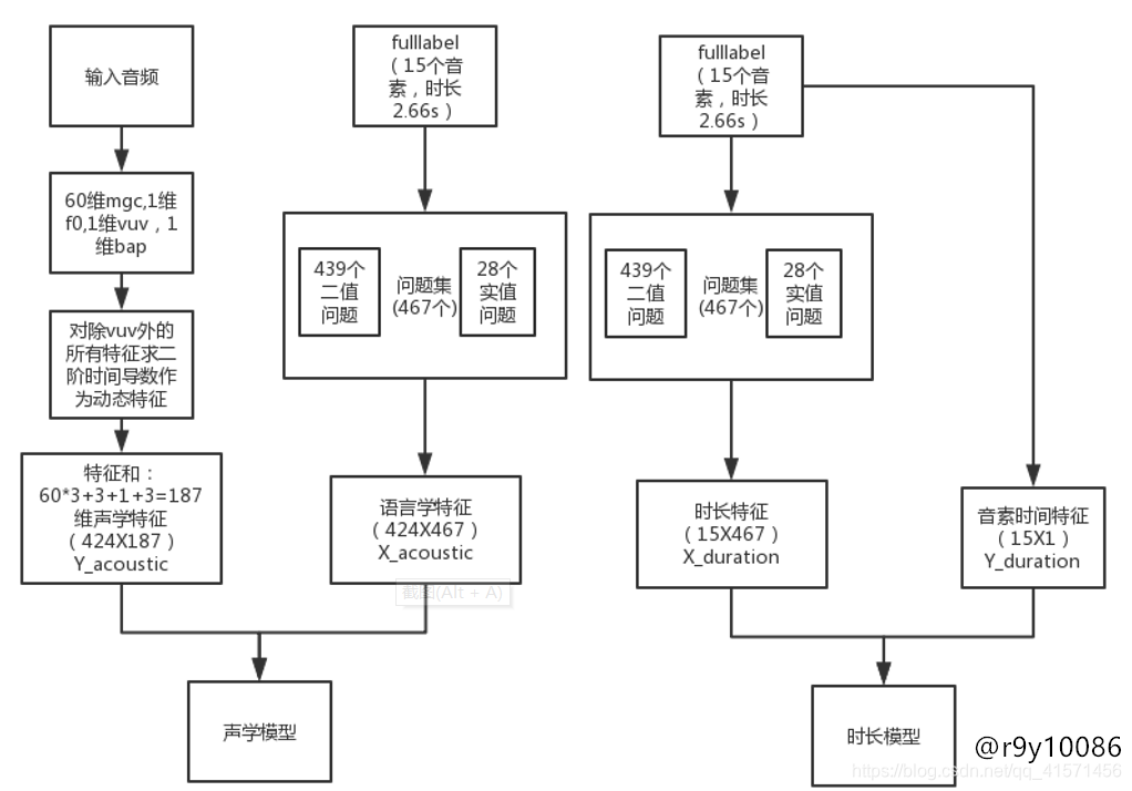 上图中使用的声码器为word,所以最左侧提取出的特征分别为mgc(梅尔谱)、f0(基音频率)、bap(非周期性,二次傅里叶变换并排序后的比值)、vuv(端点检测结果)。由于基音估计不准确(个人认为),合成的效果带有严重的合成音。最后,前端生成的特征矩阵将用于训练声学模型和时长模型,声学模型用于预测合成音频的特征,时长模型用于预测音素发音时长。