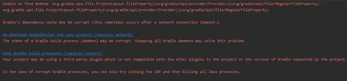 本文主要是介绍Unable to find method ‘org.gradle.api.file.ProjectLayout.fileProperty(Lorg/gradle/api/provider/Provi,希望对大家解决编程问题提供一定的参考价值,需要的开发者们随着小编来一起学习吧!