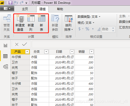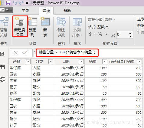 同样是使用“合计销量”为例子,新建有度量值如下: