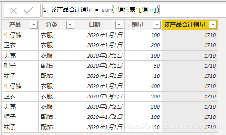 例如现在想新建一列,计算每个产品两天的合计销量(实际应用中,会再使用当天销售/合计销量,计算当天的销售占比,以进行运营分析)
