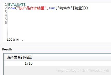 编写dax语句sum('销售表'[销量]) 运行如下。